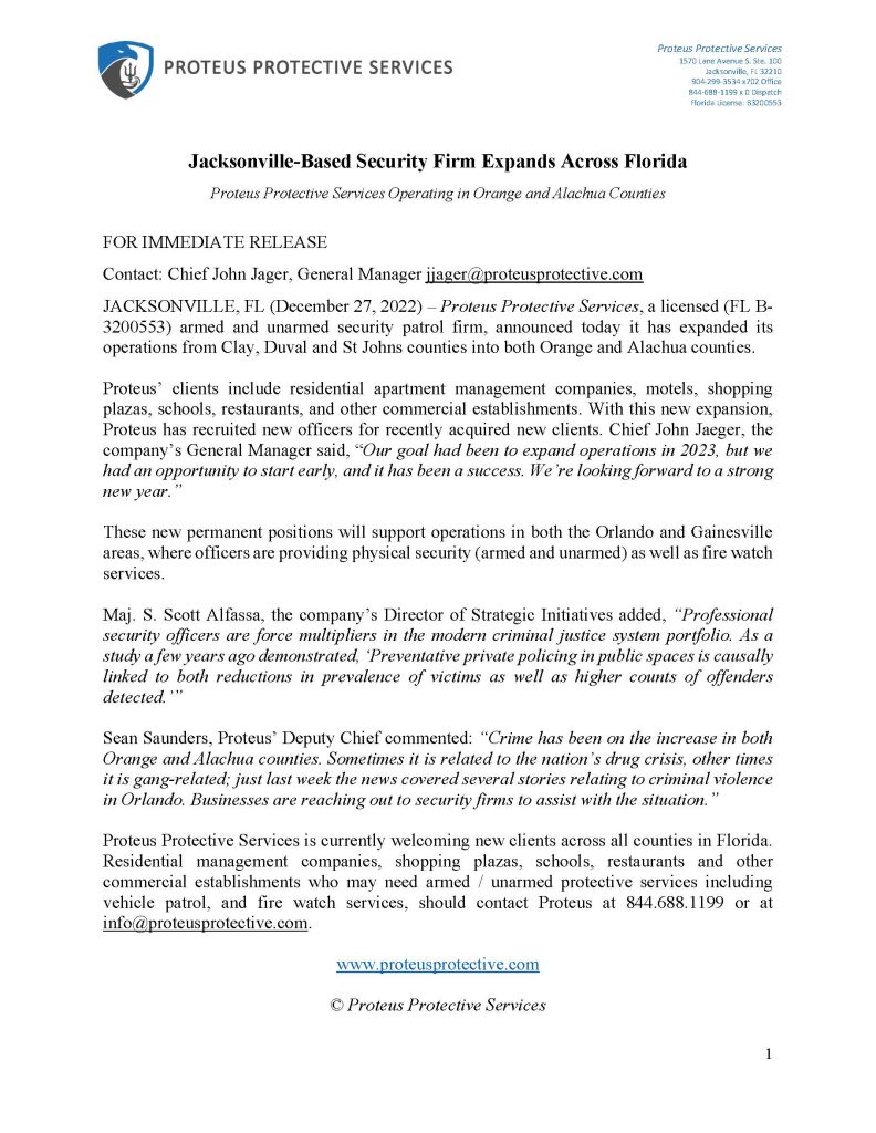 12/27/22 – News Release Jacksonville-Based Security Firm Expands Across Florida: Proteus Protective Services Operating in Orange and Alachua Counties